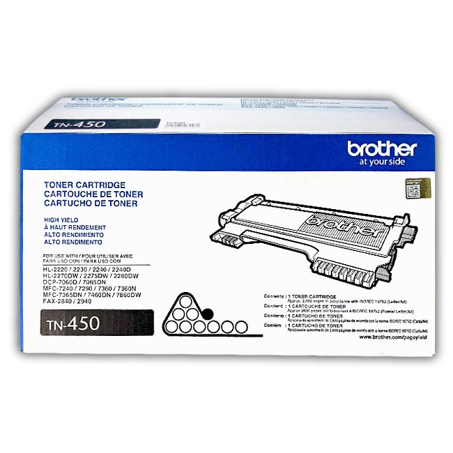 Este Cartucho de Tóner TN-450 está fabricado para usarse en los siguientes modelos de Impresoras Brother DCP7060D, DCP7065DN, HL2130, HL2132, HL2220, HL2230, HL2240D, HL2242D, HL2250DN, HL2270DW, HL2280DW, MFC7240, MFC7360N, MFC7460DN, MFC7860DW, Intellifax 2840, Intellifax 2940 las cuales realizan impresiones de alta calidad a un precio de impresión bastante económico.