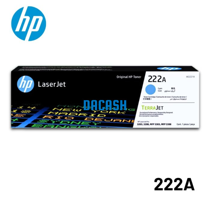 Cartucho de Toner original HP 222A impresión de alta calidad (W2221A) color Cyan para impresora HP LaserJet 3203dw, 3203dn, 3288dn, 3303sdw, 3303fdn, 3303fdw, 3388sdw, 3388fdn, 3388fdw con rendimiento hasta 1,200 páginas de impresión aproximadamente de capacidad estándar.